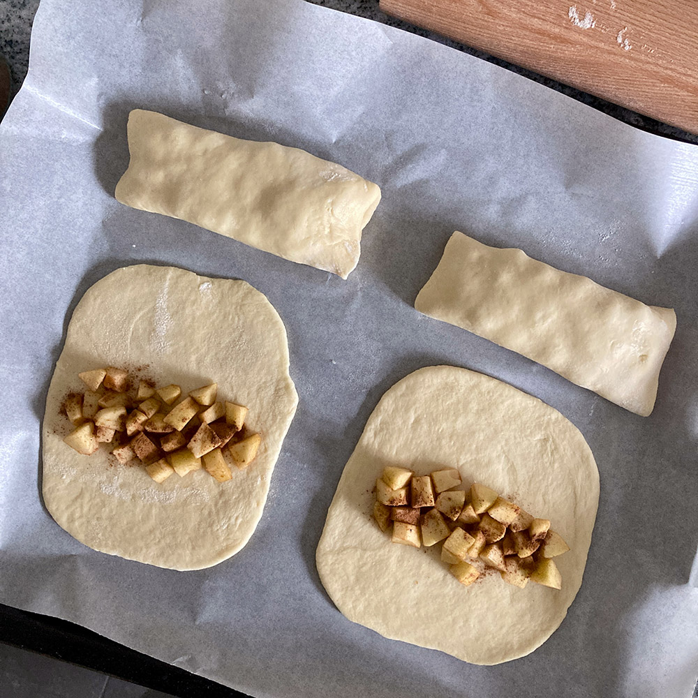 Après la première pousse de la pâte, j’ai simplement étalé quatre pâtons à peu près carrés, je les ai garnis avec les dés de pommes, j’ai saupoudré de cannelle et j’ai replié pour obtenir des petits pains rectangulaires. Je les ai ensuite laissés lever 30 minutes, avant de les badigeonner d’un mélange de yaourt végétal et de sirop d’érable, et de les cuire au four à 180° C pendant 25 minutes.