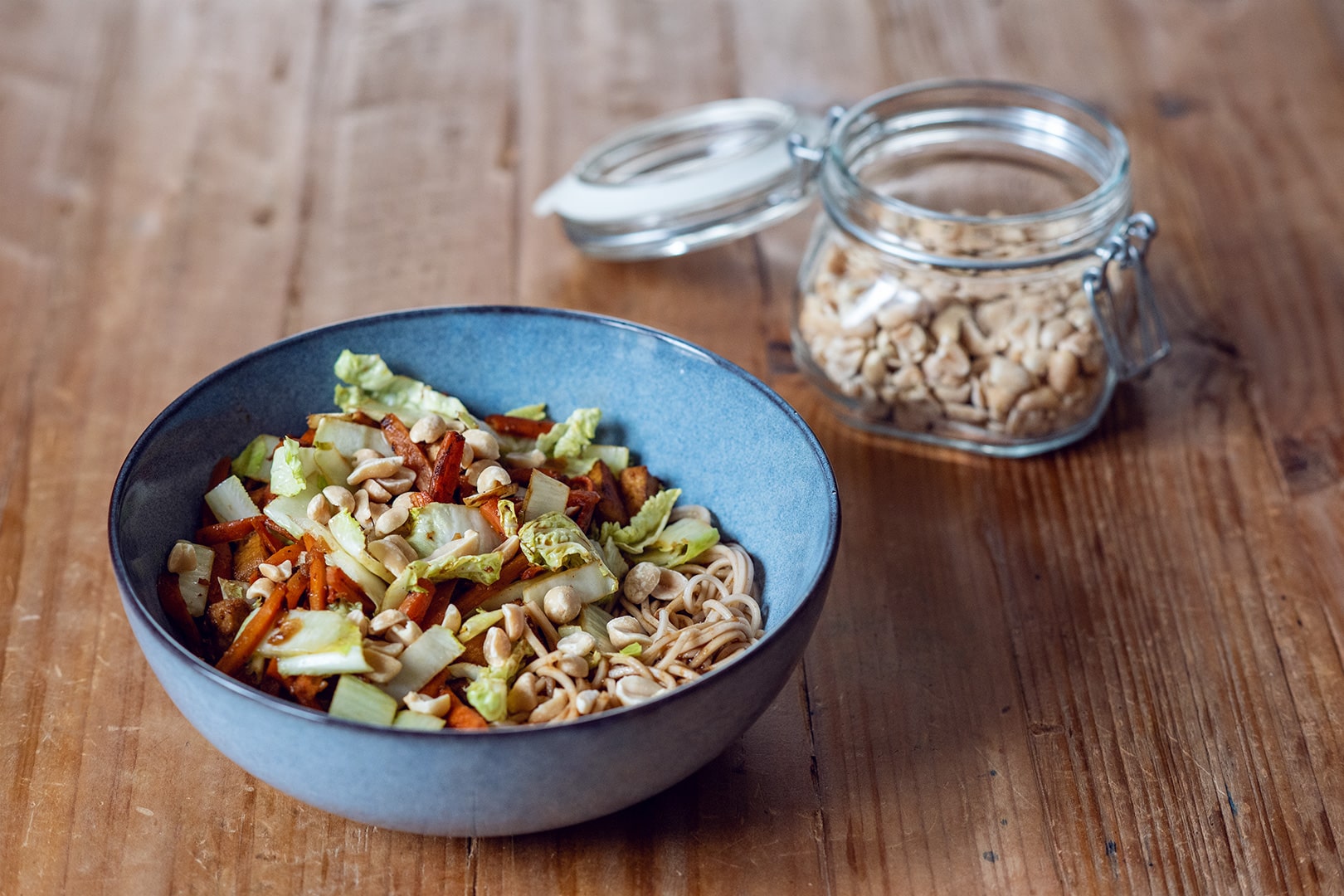 J’y mets aussi en général du tofu nature que je fais griller un peu avant d’ajouter les légumes dans la poêle, et de laisser le tout cuire ensemble un moment avant d’ajouter les nouilles. Cette fois-ci j’ai utilisé le tofu à la japonaise de la marque Taifun, et on peut aussi choisir une autre source de protéines: un émincé végétal, des grosses PST, du seitan.