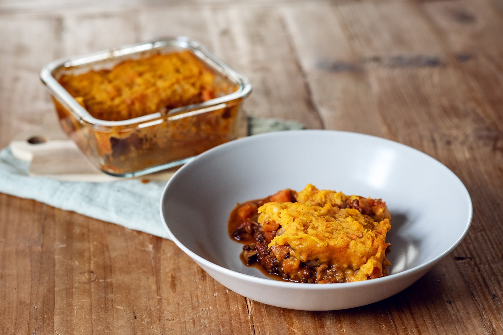 Parmentier potimarron, lentilles vertes, carottes, champignons de paris