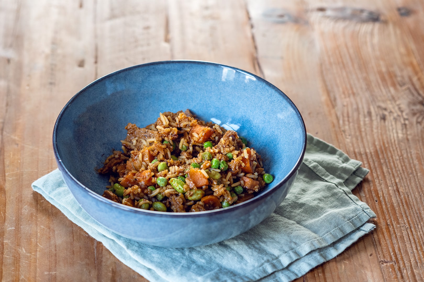 Riz sauté: seitan, patate douce, petits pois et edamame surgelés