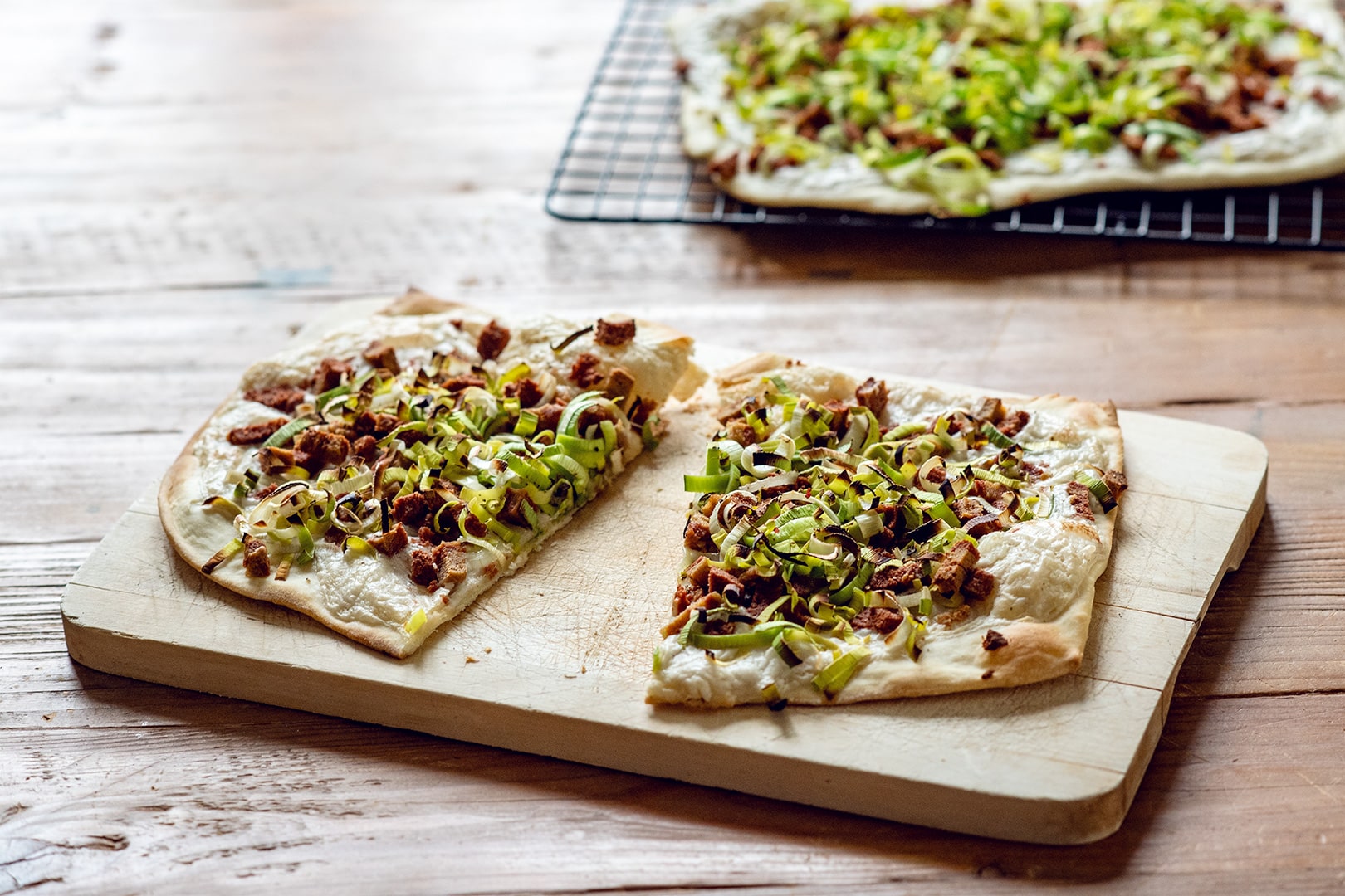 J’ai toujours aimé manger des tartes flambées lors de mes passages en Alsace ou dans le sud de l’Allemagne, mais c’est évidemment un peu compliqué à trouver en version végétalienne puisque l’ingrédient de base, c’est la crème fraiche, ou un mélange de crème fraiche et de fromage blanc selon les recettes. À cuisiner soi-même, en revanche, ça ne présente aucune difficulté: soit on utilise tout simplement une crème acidulée épaisse du commerce (encore une fois, celle de New Roots est parfaite, mais ça existe aussi dans d’autres marques, par exemple chez Sojami ou Soyana), soit on la prépare maison. J’ai trouvé deux recettes que je n’ai pas testées mais qui me paraissent très bien: celle de Deliacious, avec de la crème de soja liquide et du jus de citron; et celle du site Vegan Pratique, où la crème de soja est mélangée avec du tofu soyeux.