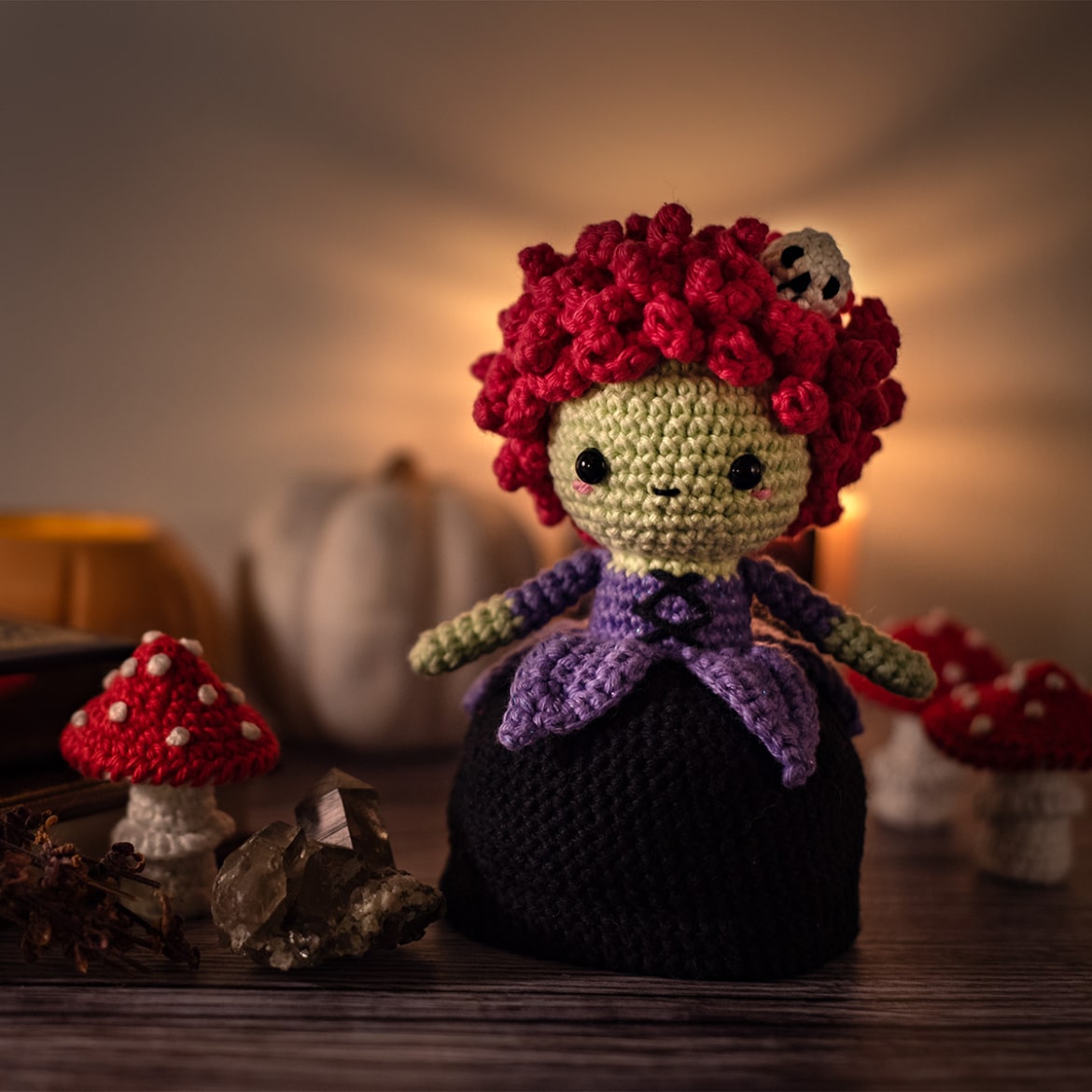 En début d’automne, j’ai racheté quelques pelotes du fil qui brille dans le noir de la marque Ricorumi, que j’avais déjà testé l’année précédente. Je m’en suis servi pour deux petits projets de saison: une fée champignon, et une sorcière qui se transforme en chaudron pour échapper aux gens pénibles. Je les adore toutes les deux, et ce fil est vraiment super rigolo à utiliser.