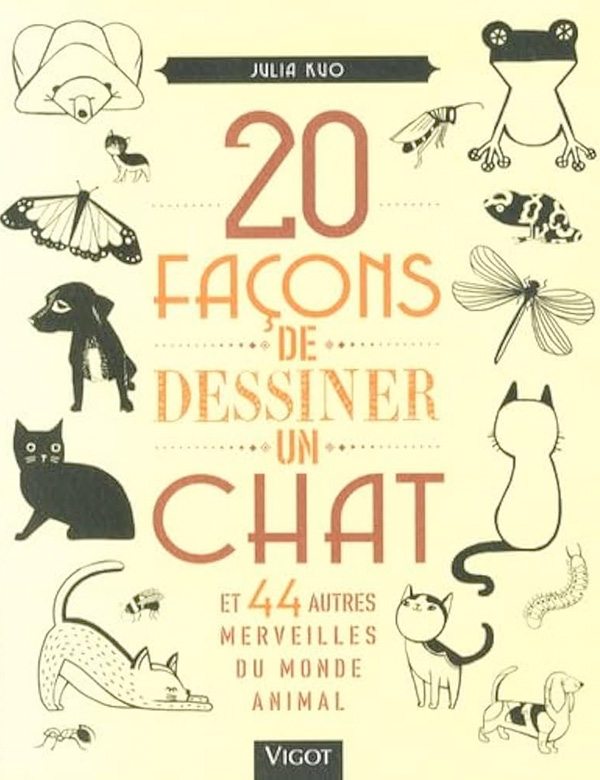 - 20 façons de dessiner un chat (et 44 autres merveilles du monde animal), de Julia Kuo – Comme son titre l’indique, ce livre regroupe 900 petits exemples de dessins d’animaux, dans des styles variés, certains très stylisés, d’autres plus réalistes. C’est une chouette base d’inspiration pour des petits dessins rapides et mignons.