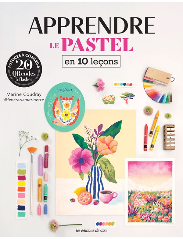 - Apprendre le pastel, de Marine Coudray – Excellent hasard de calendrier, pile au moment où je développais une légère obsession pour les Neocolor, Marine Coudray annonçait la sortie de son livre dédié à ce medium. Je la suivais sur Instagram il y a des années quand elle peignait des plantes et des compositions abstraites à l’aquarelle (le print de cette branche d’eucalyptus avec sa feuille dorée est d’ailleurs encadré à côté de mon bureau depuis 7 ou 8 ans) mais j’avais un peu raté son passage à d’autres techniques. C’était donc une excellente surprise ! Elle mentionne aussi rapidement les pastels à l’huile, mais ce sont bien principalement les Neocolor aquarellables qui sont utilisés dans les tutoriels et les 10 exemples de projets que contient le livre. On y trouve également les contributions de cinq autres artistes, notamment Clara Debray et Anne-Lise Avril dont j’ai récemment découvert le travail respectivement sur Youtube et Instagram.