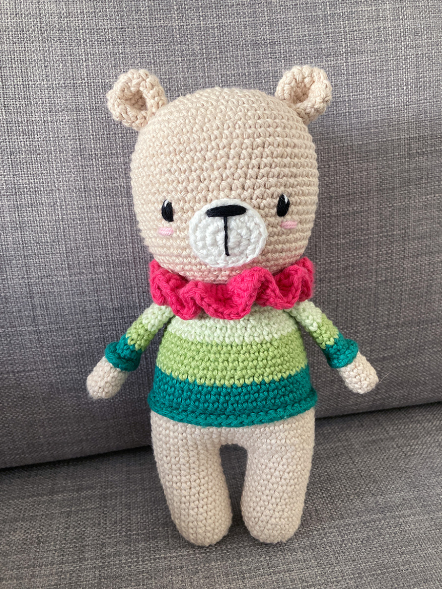 Pendant l’été, pour sortir d’une sorte de « panne de crochet » dans laquelle j’ai plongé après avoir terminé la poupée Elphaba, j’ai réalisé un petit ourson tiré d’un livre de Khuc Cay. C’est un patron assez simple et rapide à faire, parfait pour m’y remettre. Comme il était destiné à un enfant de moins de trois ans, j’ai brodé les yeux plutôt qu’utiliser des yeux de sécurité en plastique. Je crois que c’est une des premières fois que je suis aussi satisfaite d’yeux brodés, d’habitude non seulement je déteste faire ça, mais en plus je trouve que c’est toujours moche.