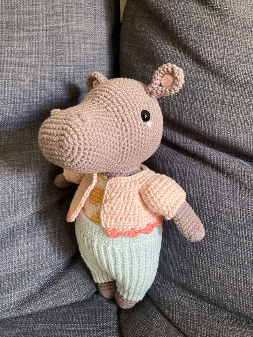 Après deux ans de procrastination, j’ai enfin terminé le modèle « Peggy Hippopotamus » de Pica Pau. J’adore les modèles de cette créatrice, avec leurs petits vêtements trop mignons, mais ça fait beaucoup de pièces à crocheter puis à assembler, ce qui augmente la probabilité d’être rattrapée par la flemme.