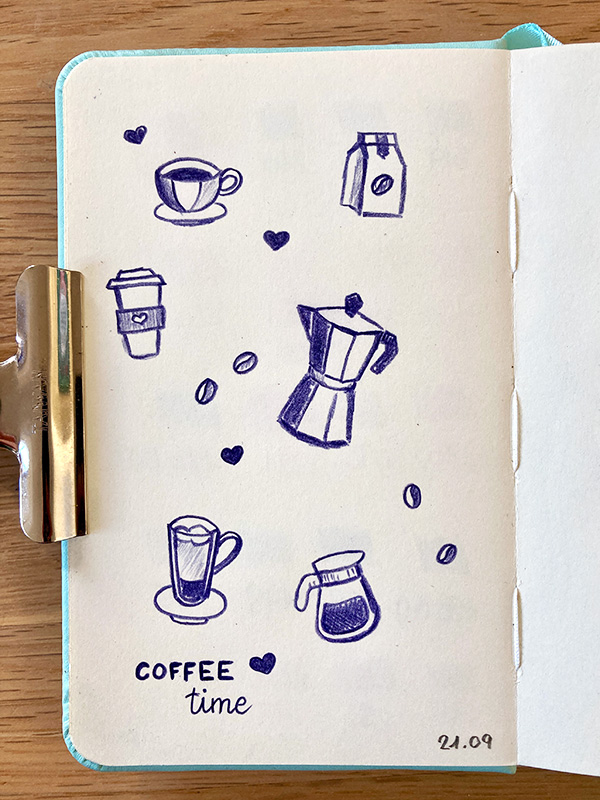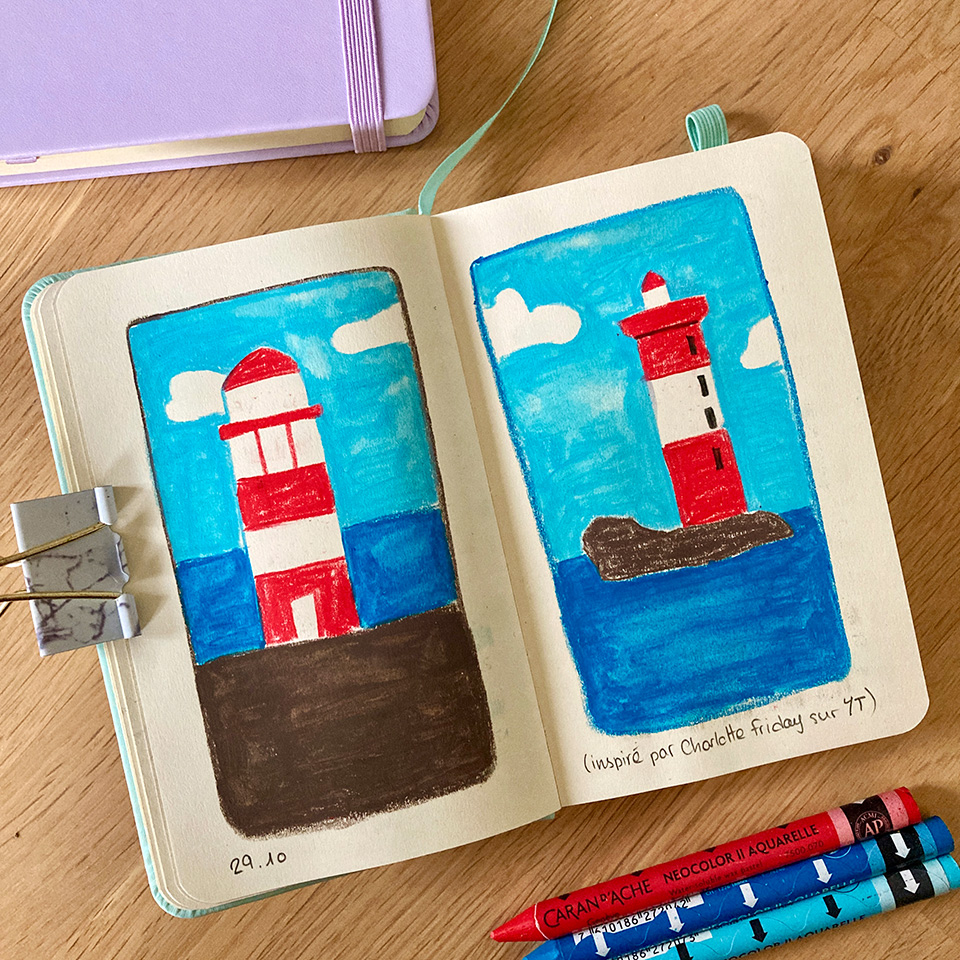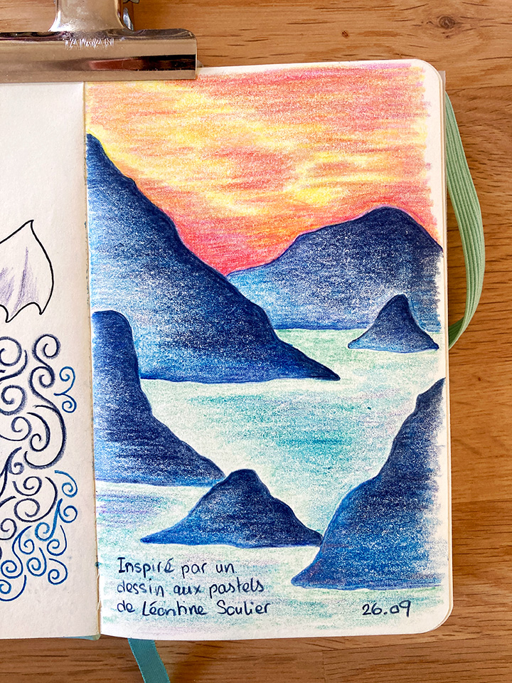 Pour me motiver à dessiner à d’autres moments que pendant de mon cours hebdomadaire, je me suis offert trois carnets de formats différents. J’aimerais beaucoup m’en servir pour dessiner à l’extérieur, mais je n’ai pas encore réussi à sauter le pas (c’est un de mes objectifs pour le printemps prochain). J’ai quand même trimballé un de mes petits carnets en vacances, et surtout j’aime bien les utiliser aussi quand je dessine chez moi. Je trouve chouette de les voir se remplir, même si c’est plutôt lentement, et de me dire qu’avec le temps ils deviendront les témoins de ma persévérance et de ma progression.