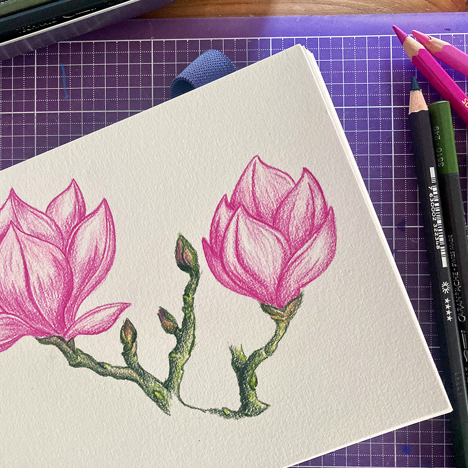 Quelques semaines plus tard, lors d’une après-midi créative en compagnie de Marie, en manque total d’inspiration, j’ai décidé d’arrêter de me prendre la tête et de reproduire une illustration botanique qui me plaisait. Aux crayons de couleur, sans pression et juste pour le plaisir. Il s’est avéré que non seulement je sais de toute évidence toujours dessiner (cf. les pôtites fleurs roses ci-dessous), mais surtout, et j’avais probablement besoin de ce rappel, que j’aime dessiner 4.