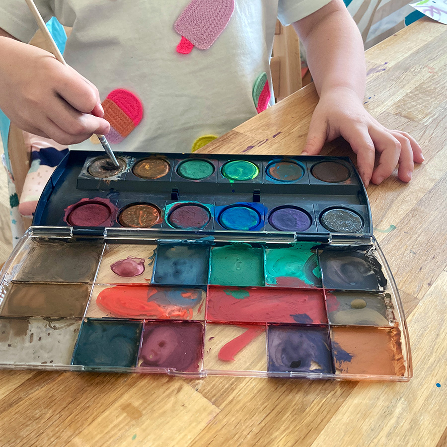 Dans nos sessions de dessin ou de coloriage, je réapprivoise la joie de juste faire pour s’amuser, pour expérimenter. On patouille de la peinture, on gribouille des formes abstraites, on colorie en dépassant. Bref on s’éclate. On ne cherche pas à faire du beau, en réalité tout est beau dans le regard d’une petite de 5 ans. Même le marron verdâtre douteux obtenu après avoir mélangé toutes les couleurs de la palette de peinture.