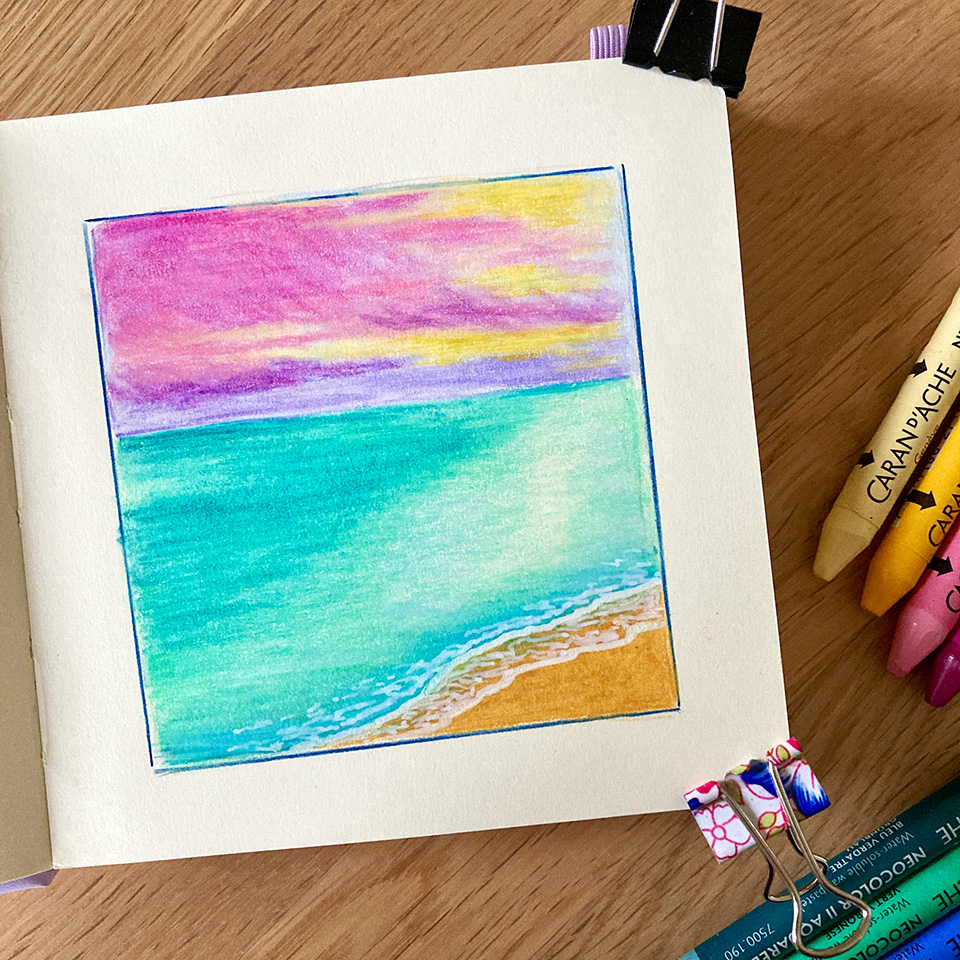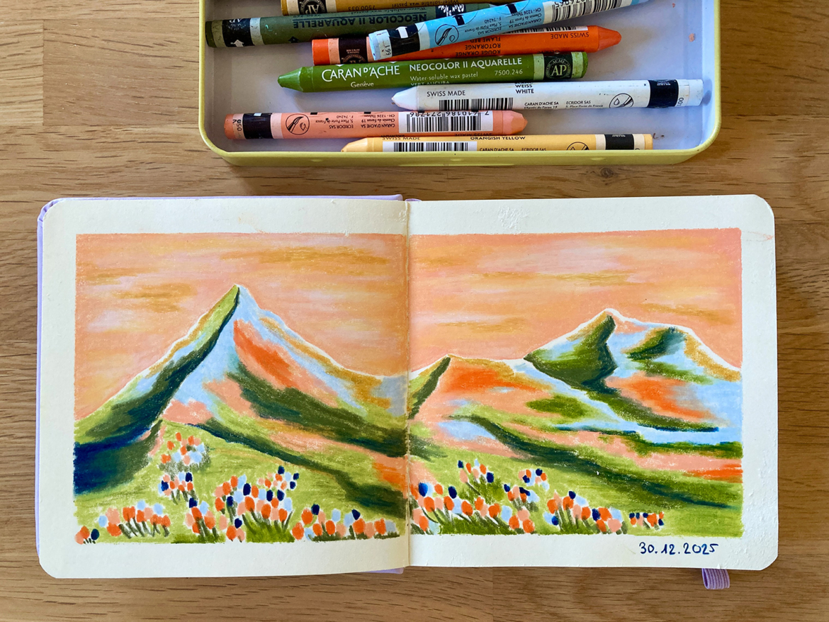 Dans le courant de l’automne, je me suis découvert une nouvelle lubie – qui a évidemment tourné à l’obsession car ici on ne sait pas faire dans la demi-mesure: les Neocolor aquarellables. J’ai pas mal expérimenté avec ce medium depuis, et J’ADORE (oui, en majuscules). C’est hyper agréable à utiliser, les couleurs sont magnifiques, et j’aime la multitude de techniques auxquelles ces petits batons de cire se prêtent.