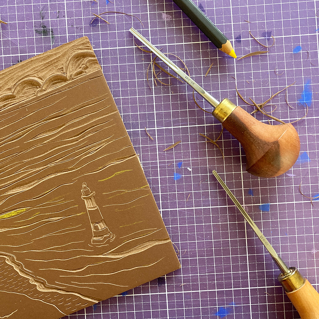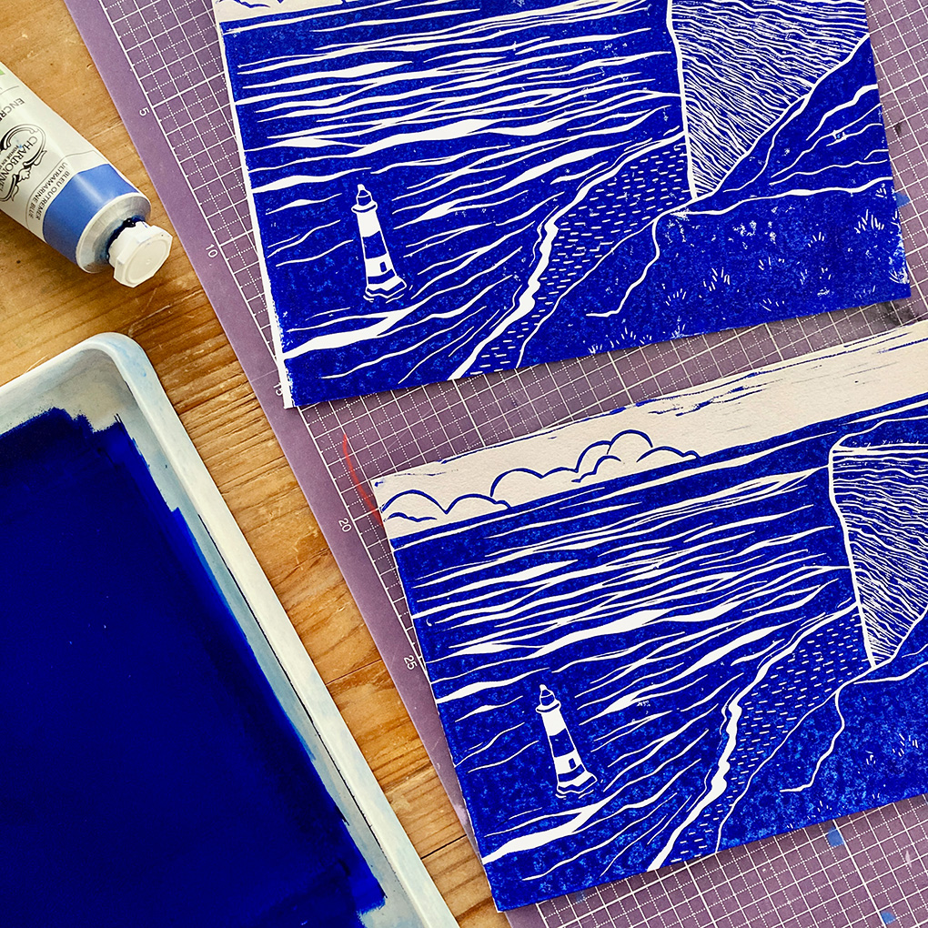 J’ai fait très, très peu de gravure cette année. En février, j’ai tenté quelques impressions d’une plaque que j’avais commencé à graver fin 2024, j’ai trouvé le résultat tout à fait meh, et j’ai lâché l’affaire. Mon problème principal avec la linogravure, c’est que j’adore la gravure en elle-même, mais je manque d’idées et surtout je n’aime pas trop l’impression. Ça ne m’amuse pas vraiment, je trouve ça laborieux, et même si au final je suis contente quand j’arrive à avoir quelques tirages passables, dans l’ensemble je n’y prends pas beaucoup de plaisir. Je galère beaucoup avec la quantité d’encre, j’ai l’impression qu’il en y a toujours soit trop soit pas assez. J’ai aussi beaucoup de mal à trouver le papier qui me convient. J’en ai testé pas mal de différents mais ça ne m’a pas aidée à déterminer s’il vaut mieux utiliser un papier lisse ou légèrement texturé (Internet ne m’aide pas davantage sur ce point et me raconte absolument tout et son contraire).