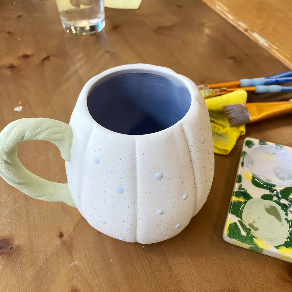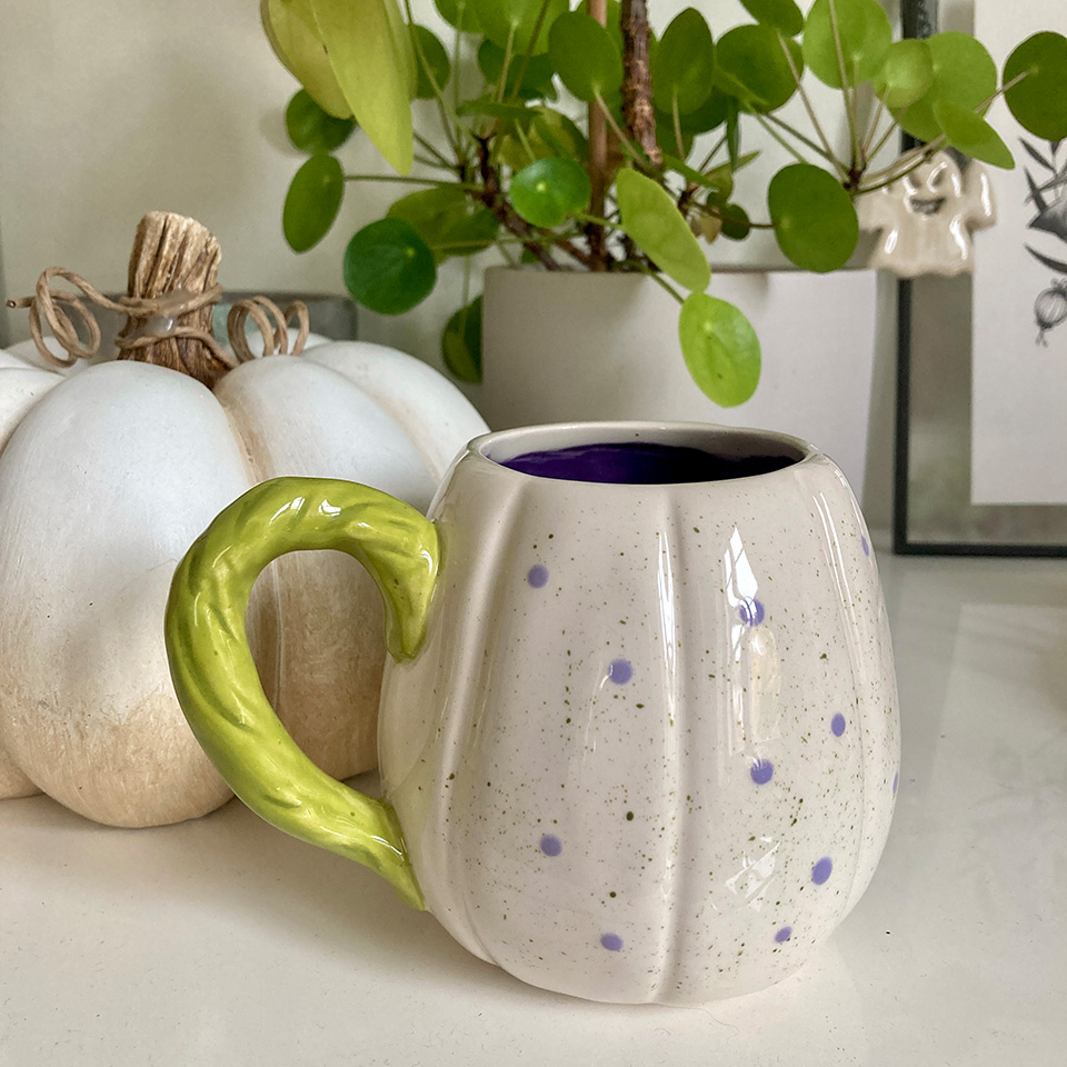 Alors là écoutez, grosse révélation: au début d’automne, une de mes copines a ouvert un café céramique, je suis allée tester, j’ai trouvé ça formidable. J’ai évidemment souffert d’un léger syndrome de « aaaaaaaah mais qu’est-ce que je vais faire j’ai pas d’idée et il faut que le résultat soit exceptionnel pour justifier d’avoir dépensé mes sous », sinon la vie ne serait pas drôle. Heureusement, par je ne sais trop quel miracle j’ai réussi à me lâcher la grappe et à juste profiter du moment. Après quelques recherches d’inspi (et un tableau Pinterest dédié), j’ai peint une tasse citrouille verte et violette que je trouve objectivement sublime.